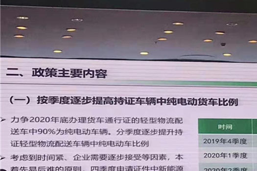 据悉,该初审实施细则指出的工作目标为:自2019年四季度起,北京市将通过分季度提升纯电动货车持证比例和实施差别化通行措施,实现“到2020年底,除冷链运输车辆外,通过办理货车通行证方式允许日间通行五环以内道路的4.5吨以下轻型物流车中,纯电动货车比例达到相关要求”。